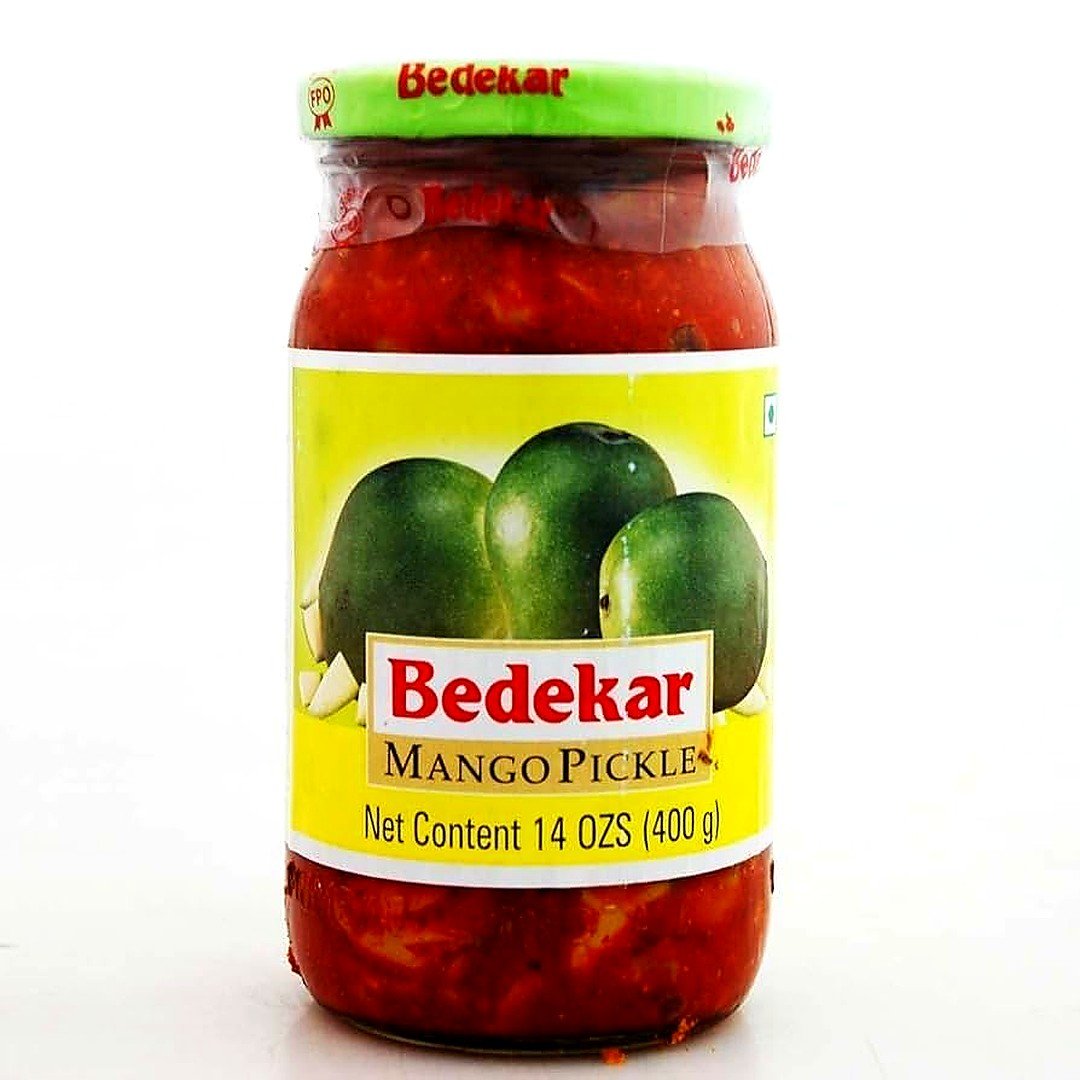 Authentic Bedekar mango pickle, delivering a tangy and spicy kick to every bite.