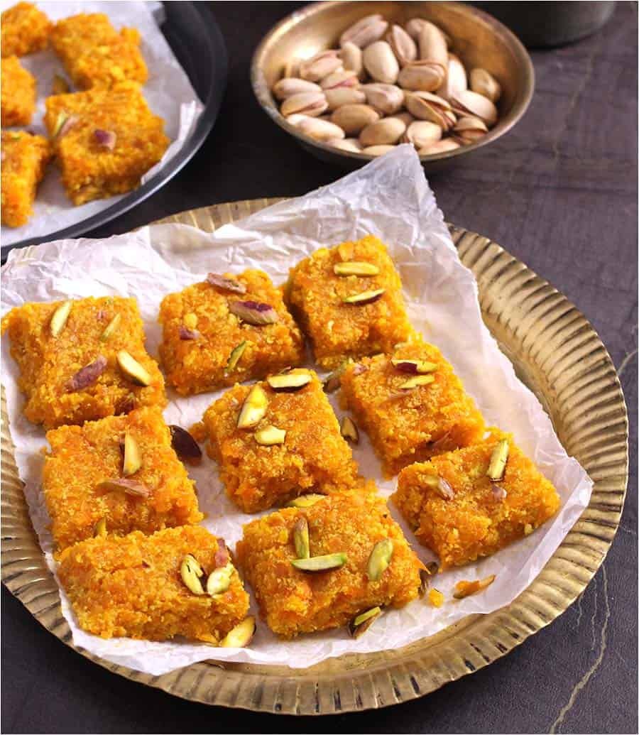 Indulge in the sweet, rich taste of traditional Gajar Barfi—a delightful Indian dessert.