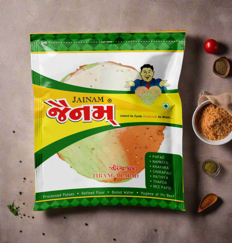 Celebrate flavor and patriotism with Jainam Tiranga Papad โ€“ a delicious, crispy snack.