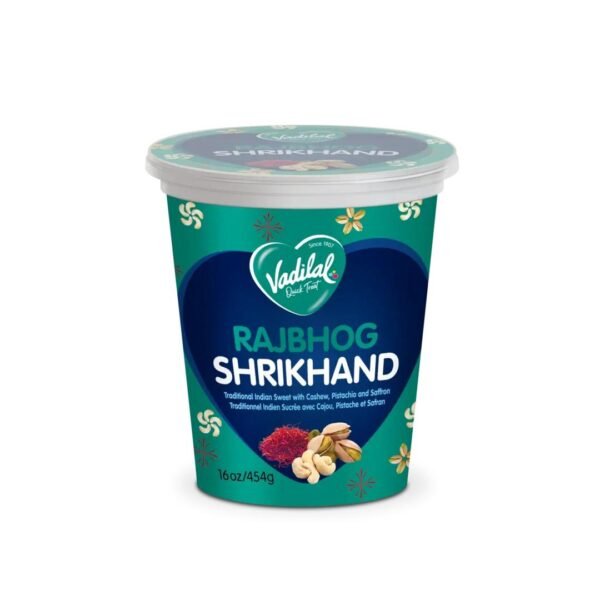 Indulge in the rich, creamy sweetness of Vadilal Rajbhog Shrikhand, a traditional Indian dessert.
